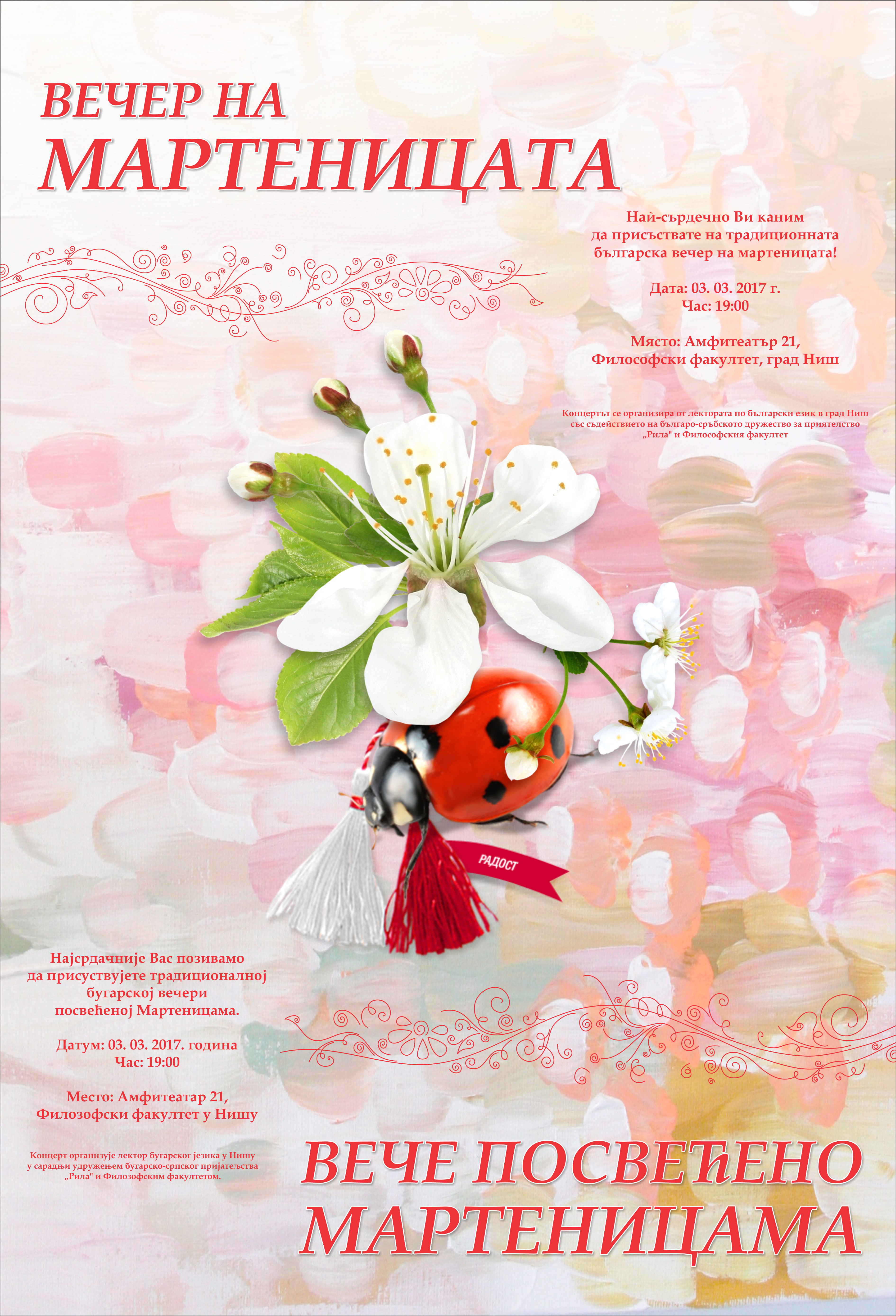 На Филозофском факултету у Нишу 3. марта 2017. године биће одржано традиционално бугарско вече посвећено мартеницама, које организује лекторат за бугарски језик.